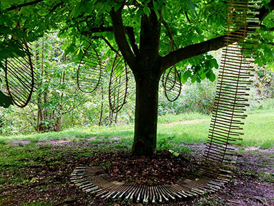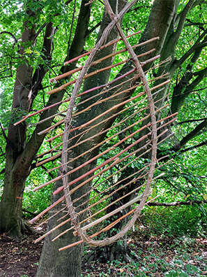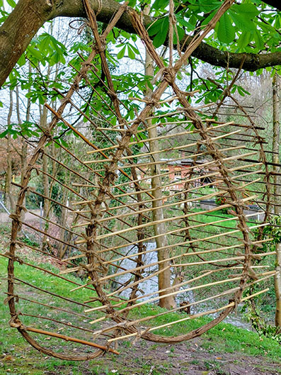 "Windharfen". Gebogene Lianen-Zweige der Waldrebe, mit Jutekordel zusammengebunden und mit Pflanzenstielen verknüpft