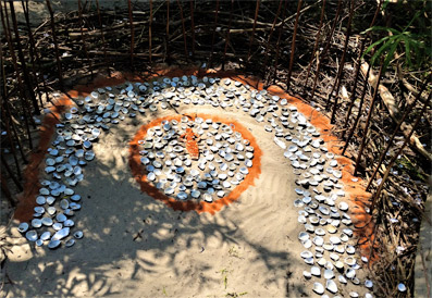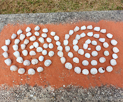 Doppelspirale, 84 leere Weinbergschneckenhäuser auf rotem Eifel-Vulkan Sand