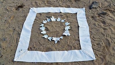 Land Art: Unendlichkeitszeichen aus Rhein-Muschelschalen (250x60 cm). Inspiration: "Etwas Bleibendes zieht vorüber" (Marcus Kürten). Ich erlebe das Wasser eines Flusses als gleichzeitig bleibend und vorüber ziehend. Sinnbild für den ewigen, unendlichen Kreislauf.