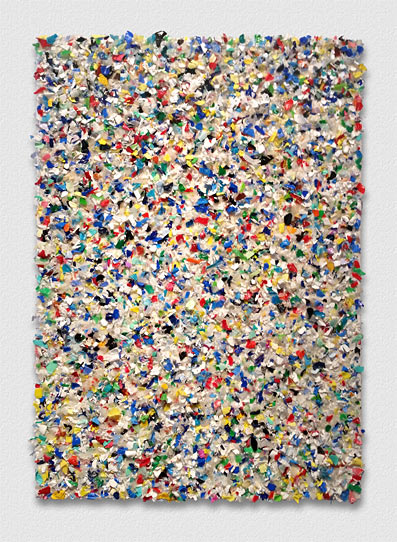 Collage auf transparenter Plastik Folie. Transparente Einmal Plastikhandschuhe, gefüllt mit farbigen Plastik Obstnetzen, die mit Krallen aus Plastik Tapes auf das reine Wasser zugreifen. Das Wasser ist symbolisch mit weißem Tape in Form des uralten chinesischen I-Ging Zeichens für Wasser dargestellt.