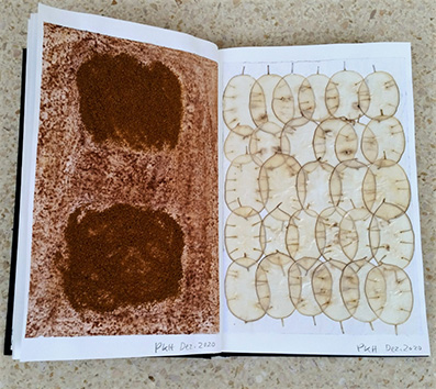 Collage mit Samen, Knospen, Ranken, Blättern und verschiedenfarbigen Erden aus aller Welt.