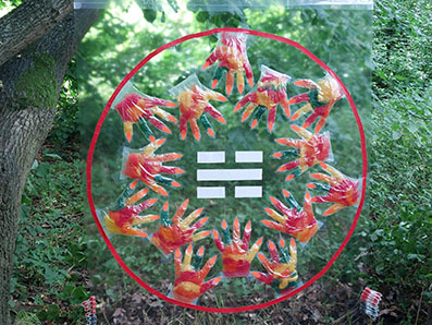 Collage auf transparenter Plastik Folie. Transparente Einmal Plastikhandschuhe, gefüllt mit farbigen Plastik Obstnetzen, die mit Krallen aus Plastik Tapes auf das reine Wasser zugreifen. Das Wasser ist symbolisch mit weißem Tape in Form des uralten chinesischen I-Ging Zeichens für Wasser dargestellt.