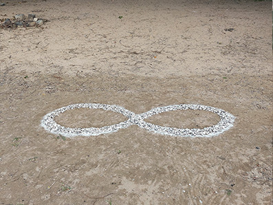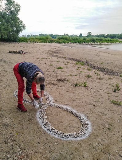 Land Art: Unendlichkeitszeichen aus Rhein-Muschelschalen (250x60 cm). Inspiration: "Etwas Bleibendes zieht vorüber" (Marcus Kürten). Ich erlebe das Wasser eines Flusses als gleichzeitig bleibend und vorüber ziehend. Sinnbild für den ewigen, unendlichen Kreislauf.